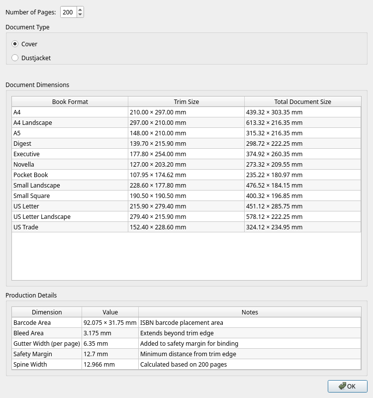 Page Count Input: Pre-filled with your current document’s page count - For interior documents: Uses the total page count from the PDF - For covers/dustjackets: Uses the value from the Pages spinbox in the toolbar