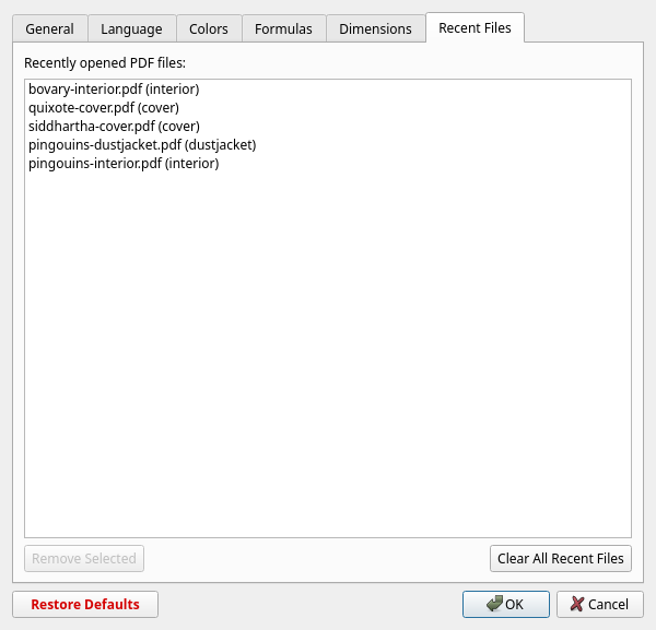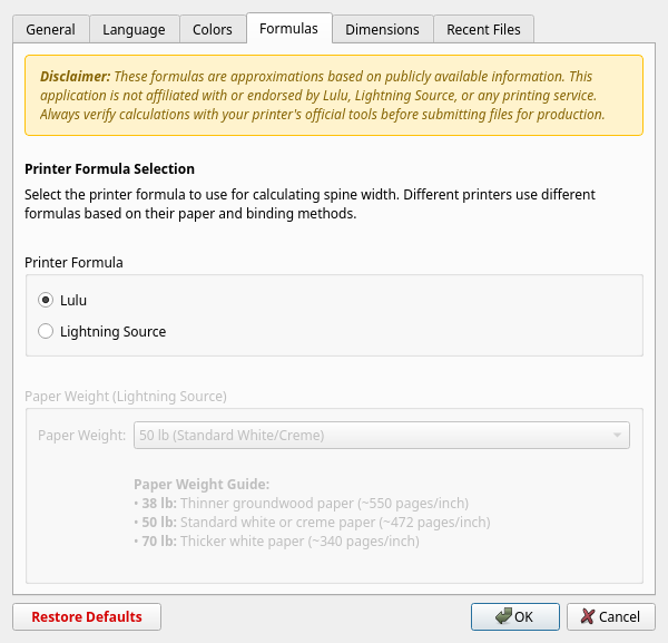 The Formulas tab allows you to select between different printer formulas for calculating spine width: