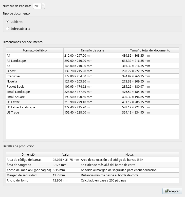 Tabla de dimensiones del documento: Muestra los tamaños totales del documento para todos los formatos de libro compatibles