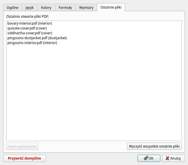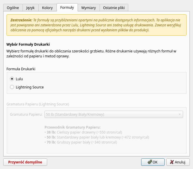 Zakładka Formuły pozwala wybrać między różnymi formułami drukarni do obliczania szerokości grzbietu:
