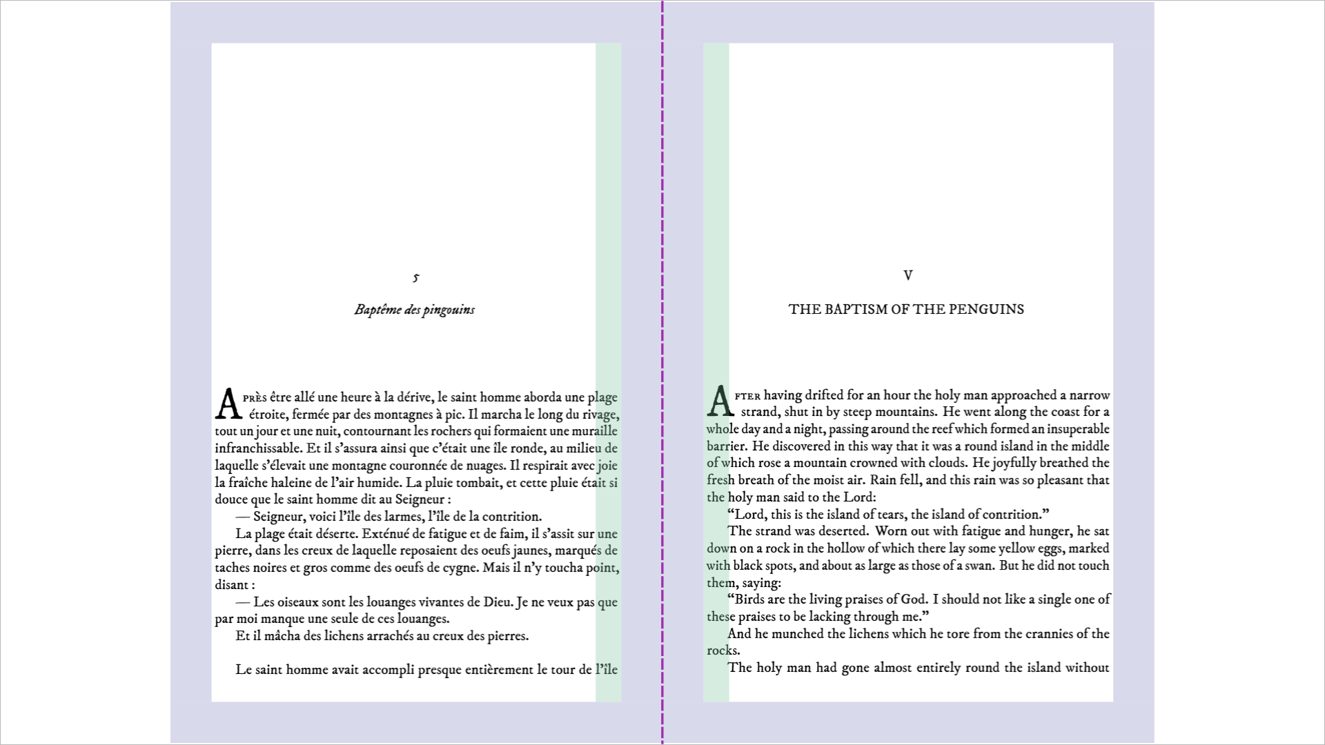Marginesy grzbietowe (zielone) z marginesami bezpieczeństwa (niebieskie) w widoku obok siebie, pokazujące jak margines grzbietowy rozciąga się do wewnątrz od marginesów bezpieczeństwa w kierunku grzbietu