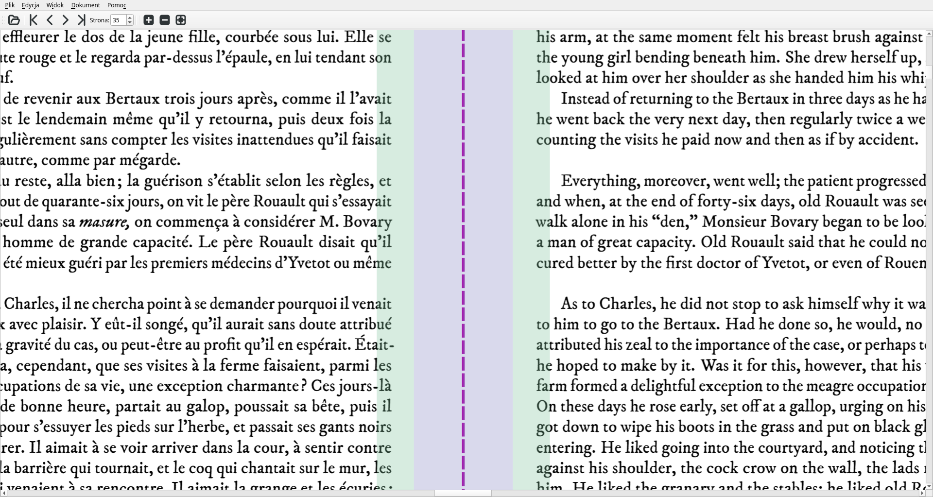 Dokumenty wewnętrzne: * linia grzbietu w widoku obok siebie * fioletowa linia ciągła między parami stron * przełączanie: Ctrl+L