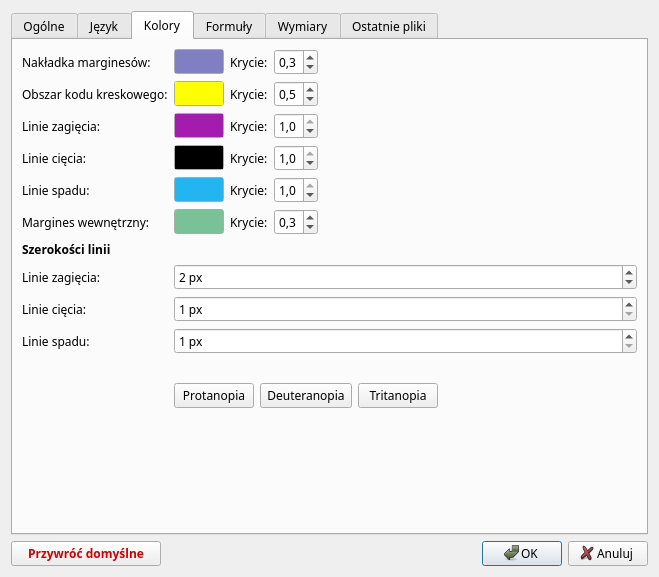 Zakładka Kolory umożliwia dostosowanie wszystkich kolorów nakładek i szerokości linii: