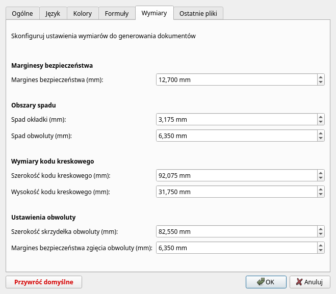Zakładka Wymiary pozwala dostosować wszystkie ustawienia pomiarów używane do wizualizacji marginesów: