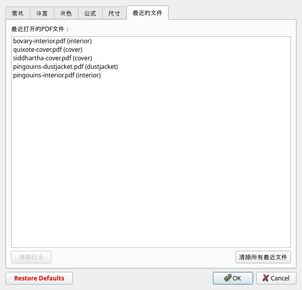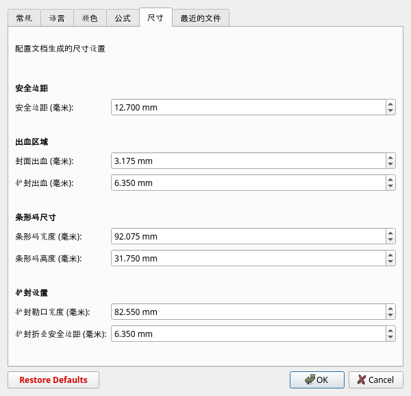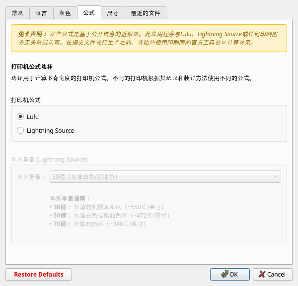 公式选项卡允许您在不同的打印机公式之间进行选择,用于计算书脊宽度: